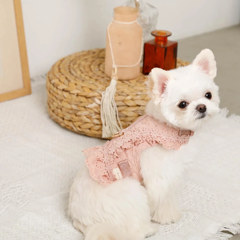 繊細なレースワークとエレガントなフリルデザインは、職人の手作業による丁寧な仕上げです。どの角度から見ても美しく、愛犬の動きに合わせて優雅に揺れるフリルが、より一層の可愛らしさを引き出します。