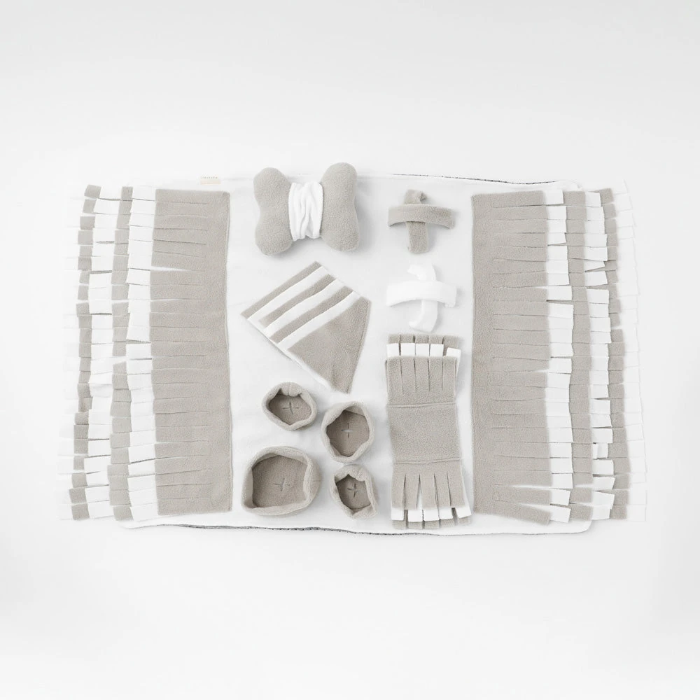 当マットは犬の行動学と認知科学の研究に基づいて開発されました。バイカラー(二色)デザインは視覚的な魅力だけでなく、異なる色の領域が犬の探索意欲を高める効果があります。高密度のポリエステル素材を使用し、洗濯機での洗濯が可能なため、衛生面でも優れています。